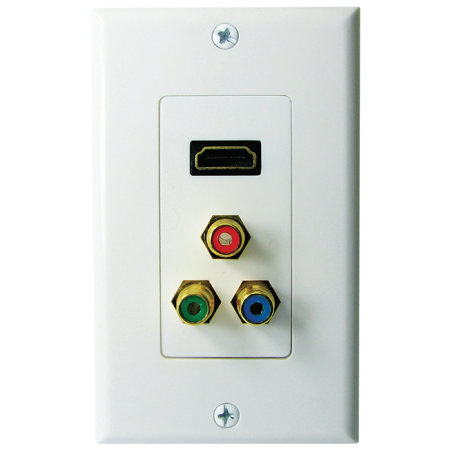 HDMI PORT FEMALE + 3x RCA (RD,GN,BL) – DECORATOR STYLE WALL PLATE & INSERT, UL – WHITE – 1 EA/PER PACK