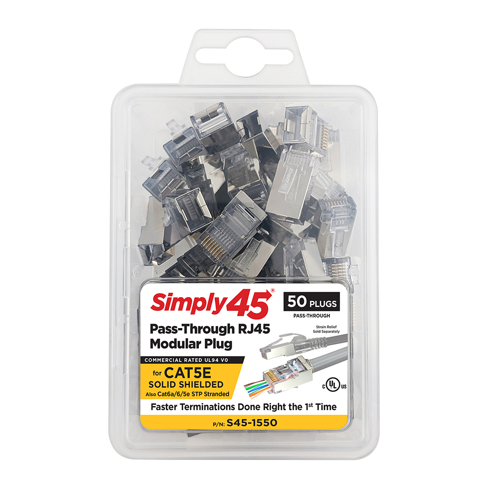 UL Listed. The S45-1550 pass-through RJ45 modular plugs are UL Listed and bear the UL Logo on the Simply45® packaging. Only Simply45® provides the UL Listed logo for quality and safety on pass-through RJ45 modular plugs. UL is the strictest 3rd party verification service in the world and products bearing the UL mark represent the highest quality and safety standards.