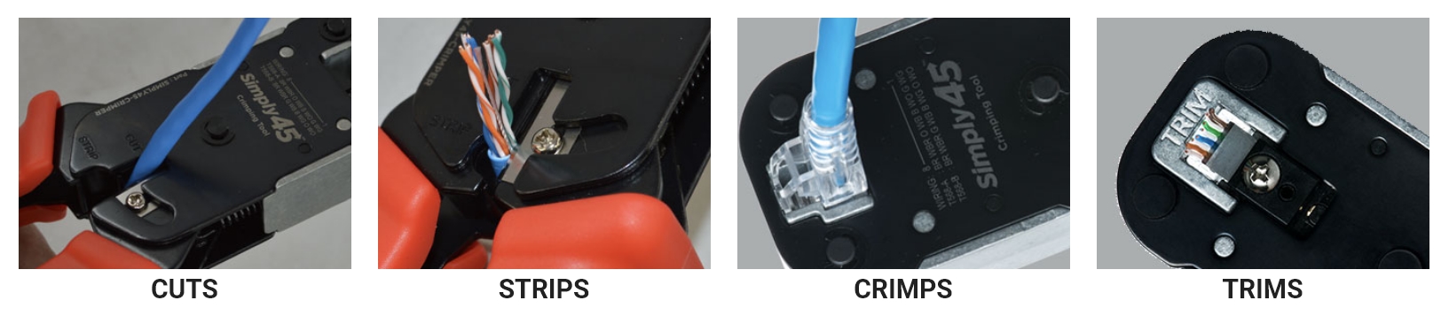The Simply45® engineers spent considerable time designing a pass-through RJ45 crimp tool that would deliver consistent flush-to-the-plug wire trimming over time.