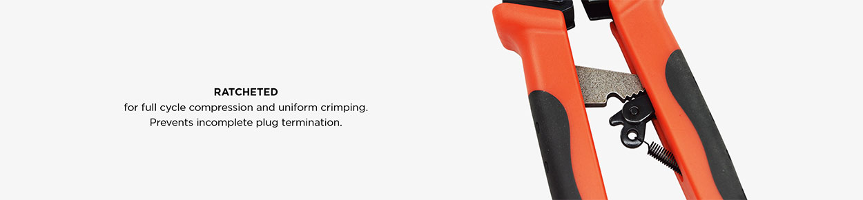 Ratcheted for Full Compression Cycle. A ratcheted crimp tool requires the installer to complete the full crimping cycle. While some RJ45 brands are eliminating this feature with their crimp tools, Simply45® knows that a ratcheted crimp tool is critical to ensuring that the RJ45 pins are properly seated onto the wire conductors and the pass-through wires are properly trimmed. A ratcheted crimp tool prevents incomplete plug termination.