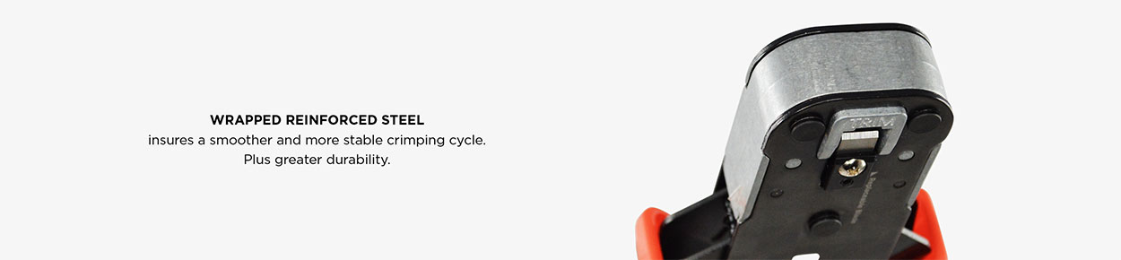 Steel Reinforced for Greater Stability. We wrapped the Simply45® Pass-Through RJ45 Crimp Tool S45-C100 with reinforced steel to ensure tool stability during the crimping cycle. When we analyzed other RJ45 crimp tools on the market we found that tools using various inserts introduced a lot of instability during the crimping cycle. Over time this instability causes poorer wire trims and incomplete RJ45 pin setting onto the wire conductors. Crimp tool stability results in a smoother crimping cycle, better pin sets, more consistent wire trimming, and greater durability over time. You can compare this to chefs in the kitchen. They can tell immediately if they have a good carving knife. They can truly feel the difference in the weight, the feel, the balance, the stability… compared to a cheaply made knife from China. That carving knife works smoothly with less effort. In our industry, the professional installer is the chef and RJ45 terminations are done in his kitchen. That is why professional installers should only use the best professional tools for the best professional results.