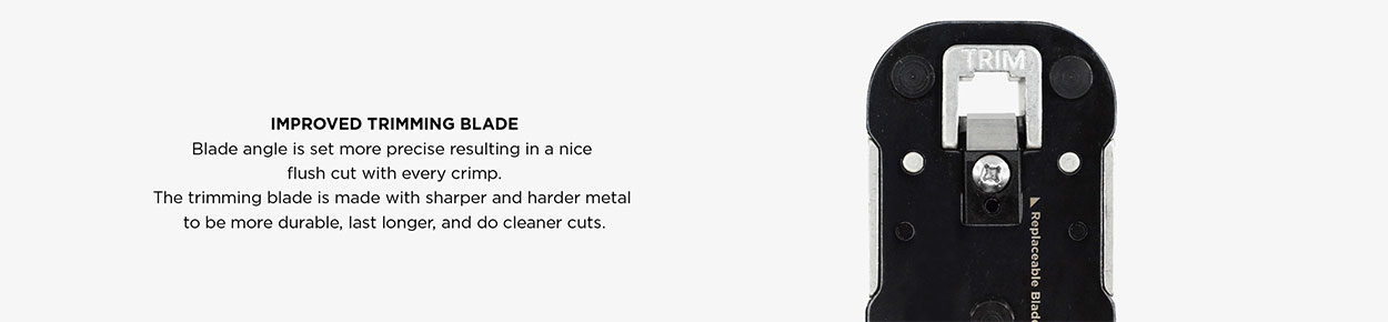Improved Trimming Blade Design. We discussed above the importance of “Tool Stability” in delivering the best RJ45 terminations. Learn more about the Importance of Tool Stability with Pass-Through RJ45 Modular Plugs here.