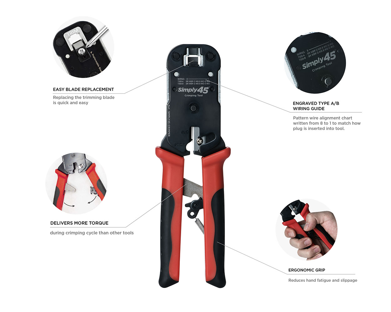 The Simply45® RJ45 Crimp Tool design utilizes BOTH handles working in tandem to deliver the crimping force with much less effort. Crimping Cat6 cables with one hand is easy to do. This lowers hand fatigue especially when you have many terminations to complete in a day.