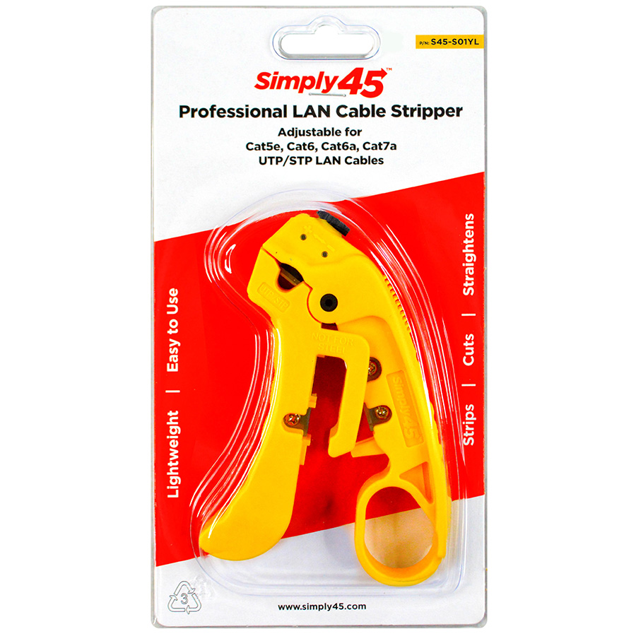 The Simply45® Professional LAN Cable Stripper is a patented easy-to-use professional LAN cable stripper that is adjustable to professionally strip both unshielded (UTP) and shielded (STP) copper LAN cables. The S45-S01YL easily strips Cat7a, Cat7, Cat6a, Cat6, Cat5e, Cat3 shielded and unshielded networking cables. This is a must-have in every installer’s tool kit.