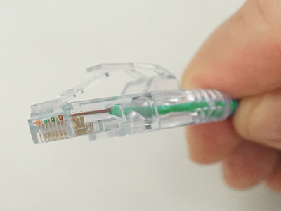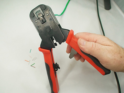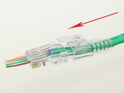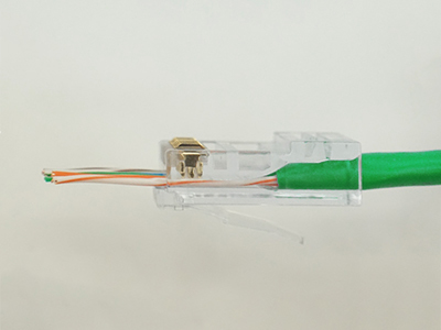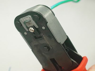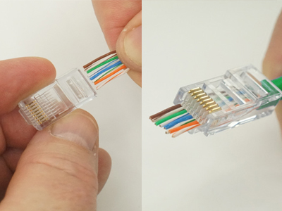 Then remove the terminated RJ45 plug from the crimping socket. Quickly inspect that all wires have been closely trimmed to the plug in the front.